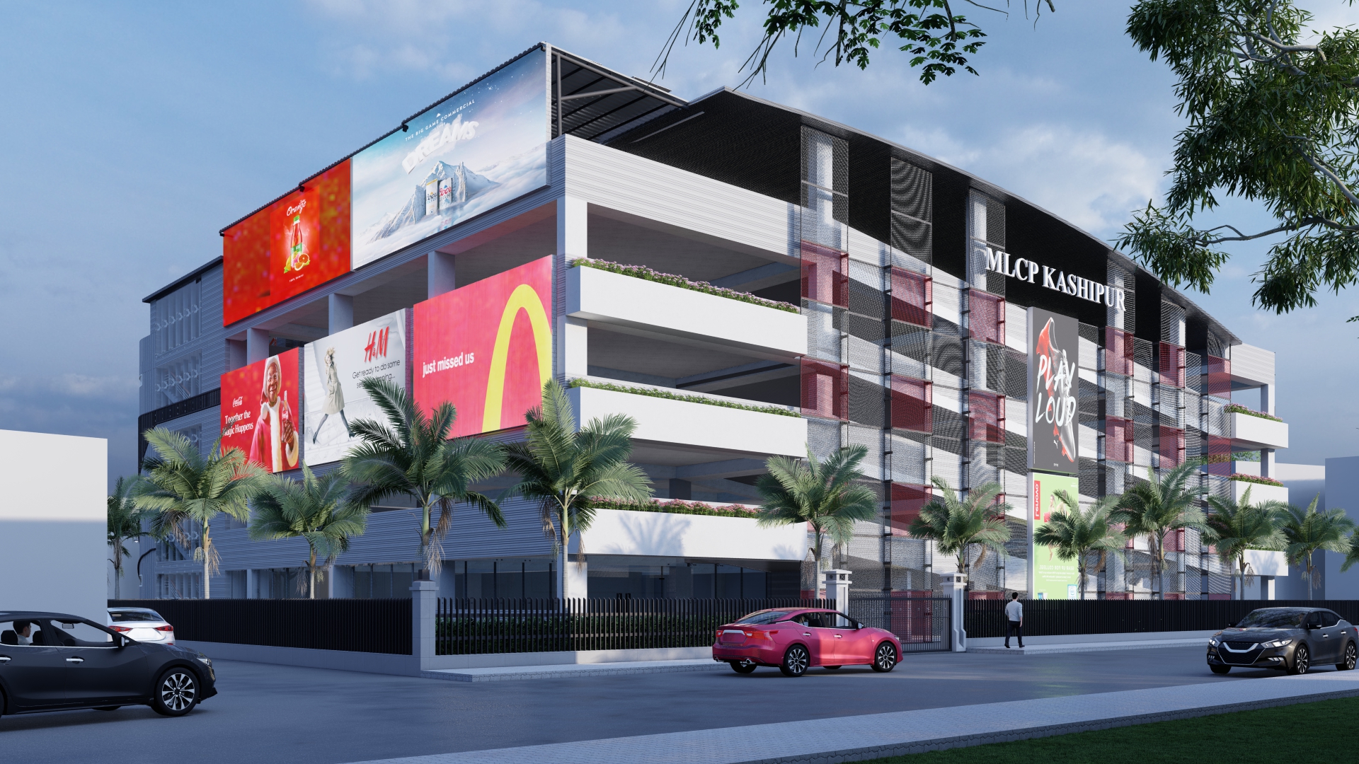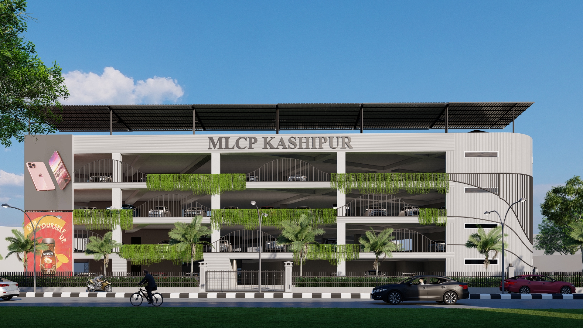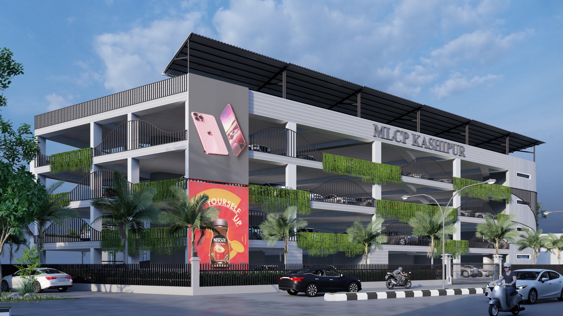 The proposed Multi-Level Car Parking (MLCP) facility in Kashipur, Uttarakhand, is a strategic urban infrastructure initiative by the Government aimed at resolving persistent traffic congestion in the city’s core. Located on Jail Road adjacent to NH-734, the project enjoys excellent connectivity to the Kashipur Railway Station and major highways. The design accommodates 150 cars over five levels, including a stilt, three parking floors, and a fourth floor housing the SP office, along with a digital library and office spaces.