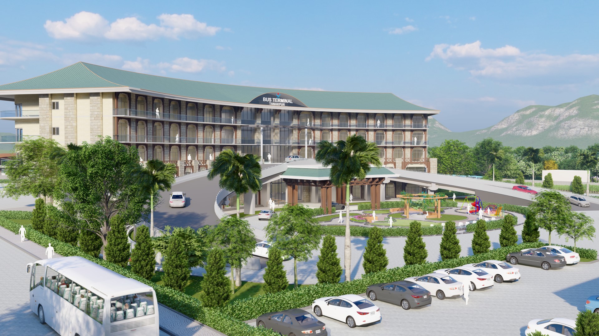The Tanakpur Bus Terminal is envisioned as a state-of-the-art transit hub that meets the evolving transportation needs of the region while promoting local character and sustainable urban development. Strategically positioned as a key gateway to Kumaon and adjoining areas, the terminal prioritizes efficient traffic flow, commuter comfort, and aesthetic appeal. The design includes dedicated bus bays, ample parking, auto and taxi stands, and well-marked drop-off zones. Internally, it will feature ticket counters, waiting lounges, restrooms, food courts, and retail kiosks, ensuring a seamless travel experience